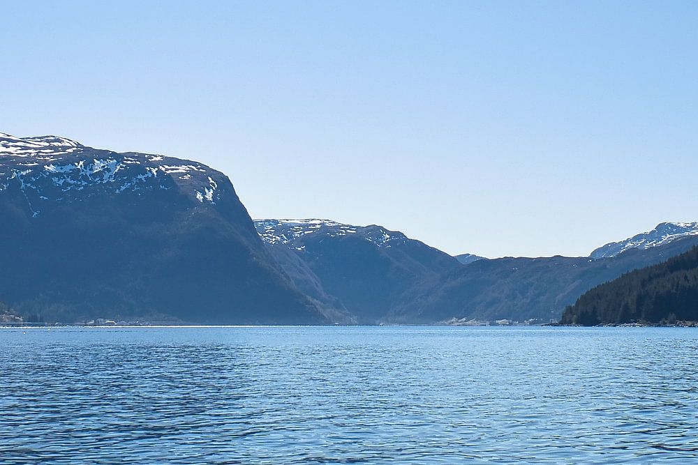 Western Cape in Norway. Fjord and sea with mountains on the coast. No clouds blue sky. Rough nature in Scandinavia
