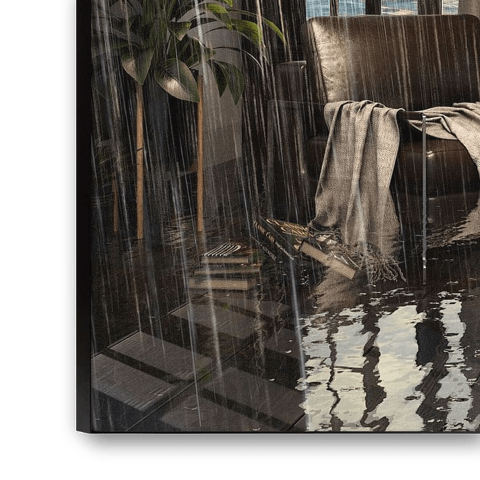 Two women find themselves in a living room that is slowly flooding as the rain continues to fall from within.