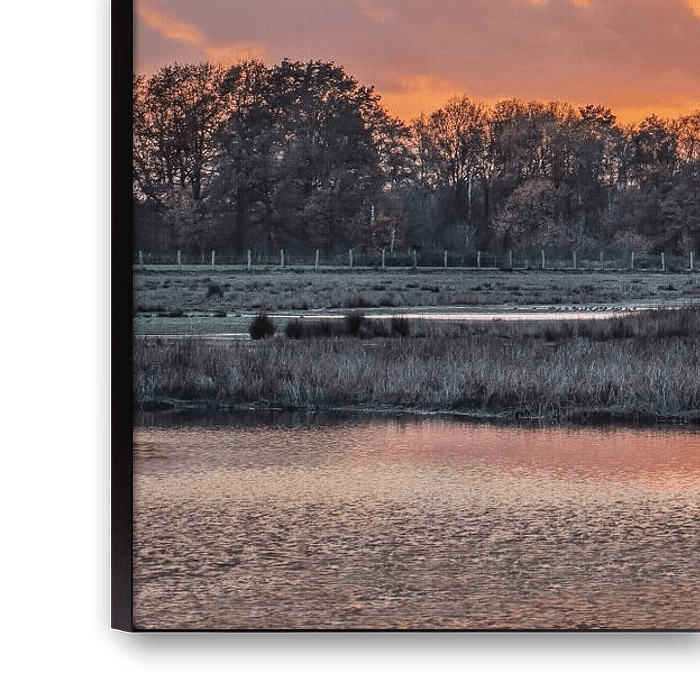 Buy this landscape artwork Wetland against orange cloudy sky during sunset by Tony Vingerhoets on canvas, ArtFrame, poster and wallpaper, printed on demand in high quality.