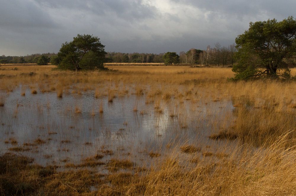 De Oude Buisse Heide is een prachtig gevarieerd natuurgebied met bos, heide en graslandschappen. De foto is gemaakt in de nadagen van de herfst na een periode met veel regen waardoor grote delen van de graslandschappen onder water staan. Een waterig zonnetje priemt net door de bewolking om de kleuren wat aan te zetten en een mooi spel van licht en schaduw te geven over het landschap.