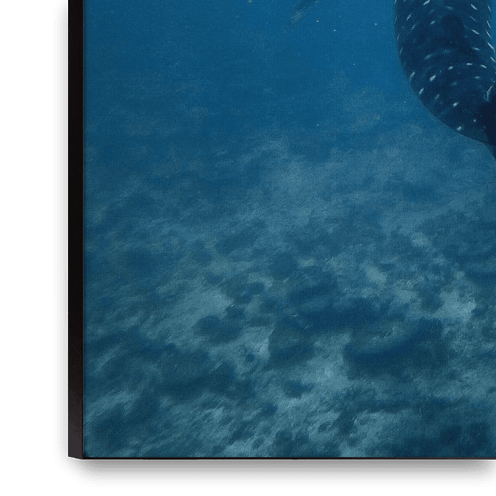 An impressive whale shark glides peacefully through the crystal-clear waters of the Maldives. The blue hues, filtered sunlight and the animal's gentle movement make this image a true work of underwater art.