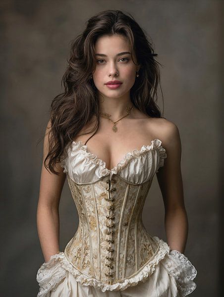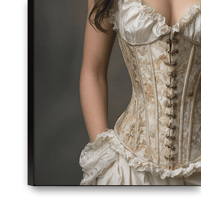 The corset looks like a second skin, precisely crafted, almost technical. Its…