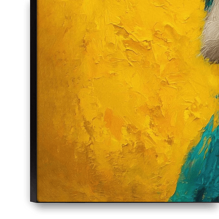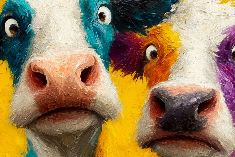 Two cows here look as though they’ve just been caught gossiping about what’s on the farmer’s menu today. With their big, surprised eyes and colourful hairstyles – as if they’ve just stepped out of a paint pot – they stare at the viewer as if to say: “Hey you… have you taken our milk?” Against the bright yellow background, they seem to…