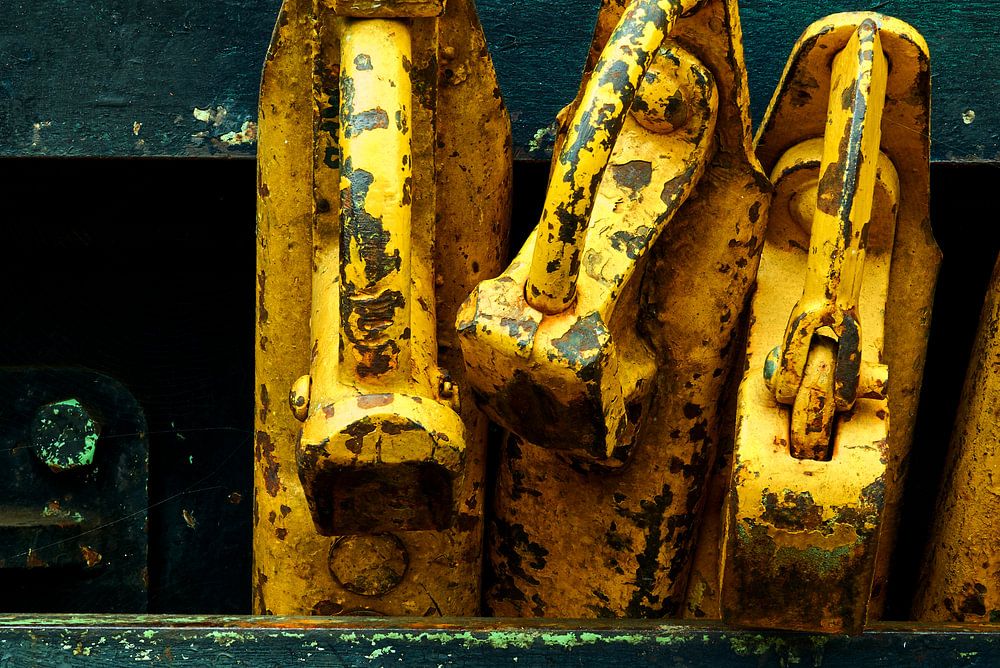 Close-up photo of wheel chocks, wedges, stoppers, to secure train wagons to the rails to prevent them from rolling away.