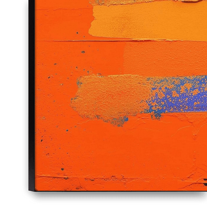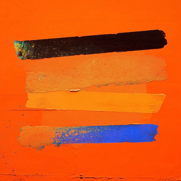 An explosion of colour and texture, with a bright orange background as the dominant backdrop against which four broad, horizontal strips of paint have been applied. Each strip is unique in colour, texture and brushstroke direction. The top strip, almost black with a hint of green, contrasts sharply with the bright orange and yellow…