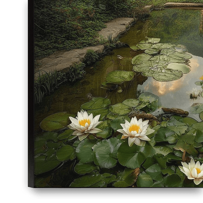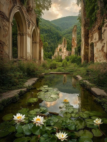 The picture shows the remains of an ancient Gothic ruin — tall arched windows and crumbling walls — opening out onto a valley with dense, green woodland. In the foreground lies a long, tranquil pond with shimmering water lilies and a mirror-smooth surface, in which the evening sky and the ruins are reflected. In the background rises a…