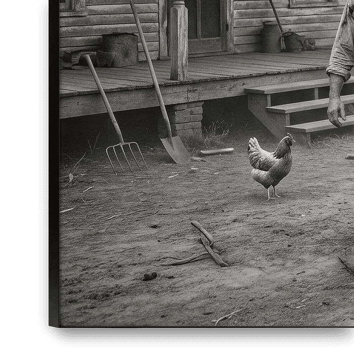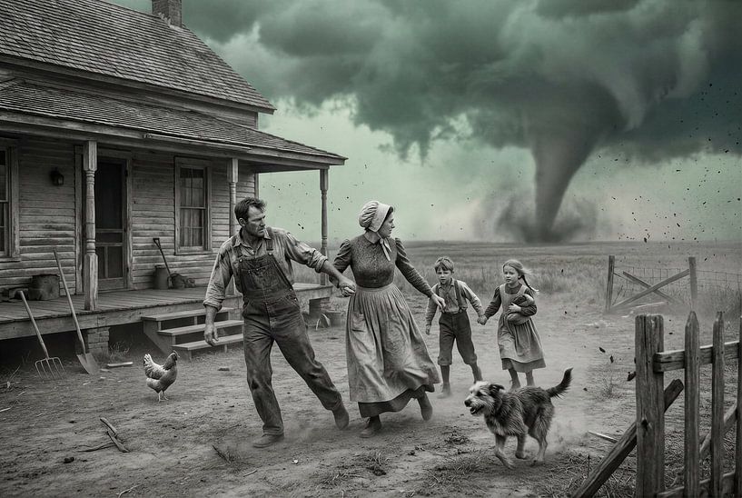 This work captures the exact moment when routine turns into survival. A family flees from what was once their home, while a tornado rises on the horizon like an indifferent force. There is no heroism, no cinematic slow motion — only movement, panic and instinct. Even the dog understands that standing still is no longer an…