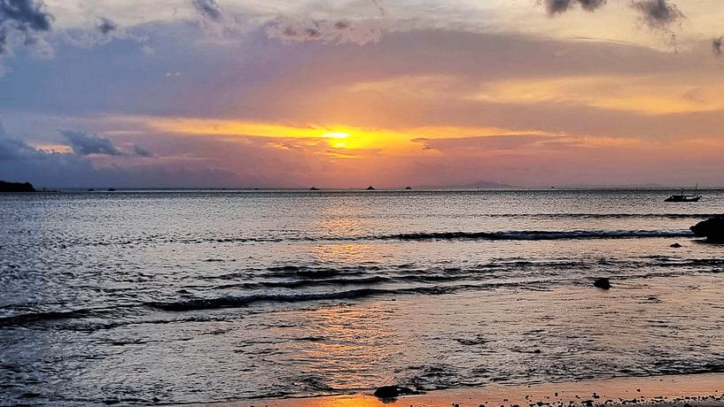 The image is a description of a picturesque sunset over the ocean, with the sun casting a warm, golden and orange glow across the sky and water. The scene depicts a sandy or rocky beach in the foreground, with gentle waves breaking on the shore, and several small boats and distant land masses silhouetted against the bright horizon.
