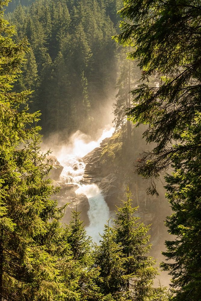 Imagine breathtaking views of the impressive Krimmler Waterfalls, Austria's highest waterfalls with a total height of 380 metres, located in the heart of the Hohe Tauern National Park. These majestic waterfalls consist of three impressive cascades, where the crystal-clear water of the Krimmler Ache plunges down the rocks with thunderous roar. Surrounded by dense forests and the rugged beauty of the Alps, the picture offers a representation of a unique natural wonder that attracts thousands of visitors every year. The fine mist that rises around the falls is known to have a soothing and even healing effect, especially for people with respiratory problems.
