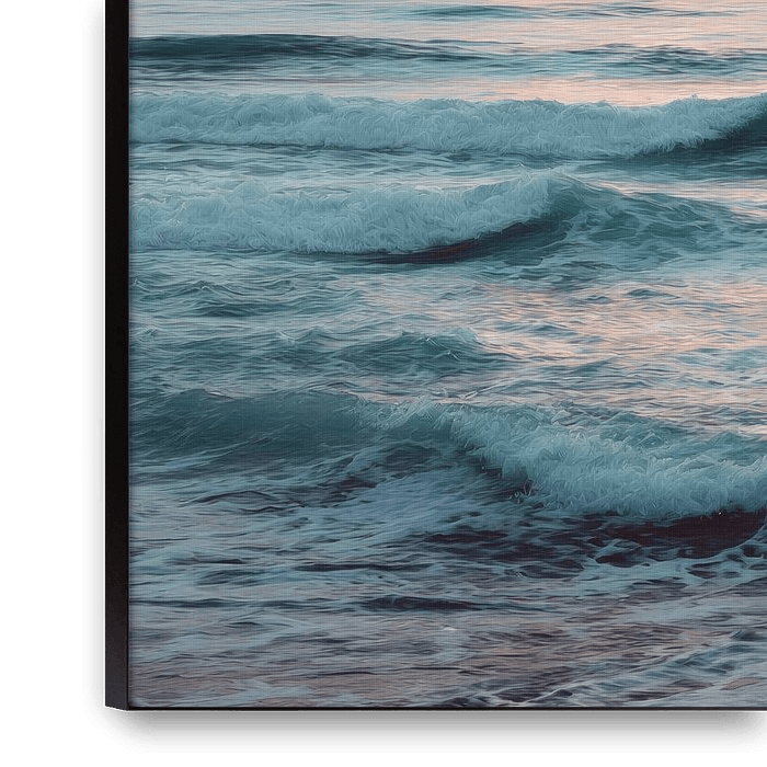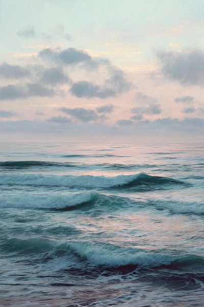 This image captures a moment when the sea and sky are barely distinguishable from each other. Gentle waves roll towards the shore in a calm rhythm, while the sky is filled with pastel colours and light clouds that filter the light. The composition exudes space and openness, with a horizon that suggests rather than defines. The work…