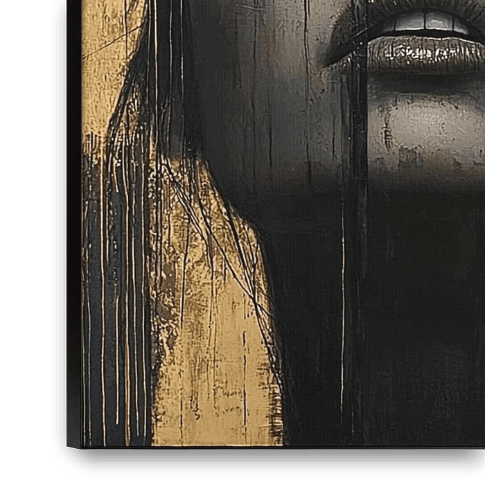An intriguing painting shows a woman's face partially disappearing in gold and black drip effects. The paint drips over her serene face like tears or raindrops, evoking a sense of mystery and power. The contrast between the shiny gold and deep black enhances the dramatic, almost dreamlike look.