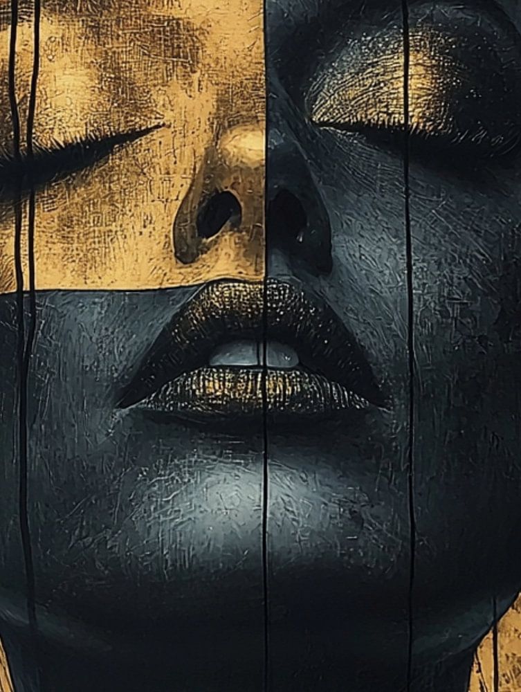 An intriguing painting shows a woman's face partially disappearing in gold and black drip effects. The paint drips over her serene face like tears or raindrops, evoking a sense of mystery and power. The contrast between the shiny gold and deep black enhances the dramatic, almost dreamlike look.