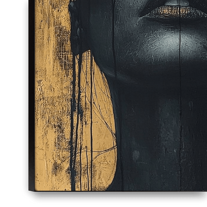 An intriguing painting shows a woman's face partially disappearing in gold and black drip effects. The paint drips over her serene face like tears or raindrops, evoking a sense of mystery and power. The contrast between the shiny gold and deep black enhances the dramatic, almost dreamlike look.