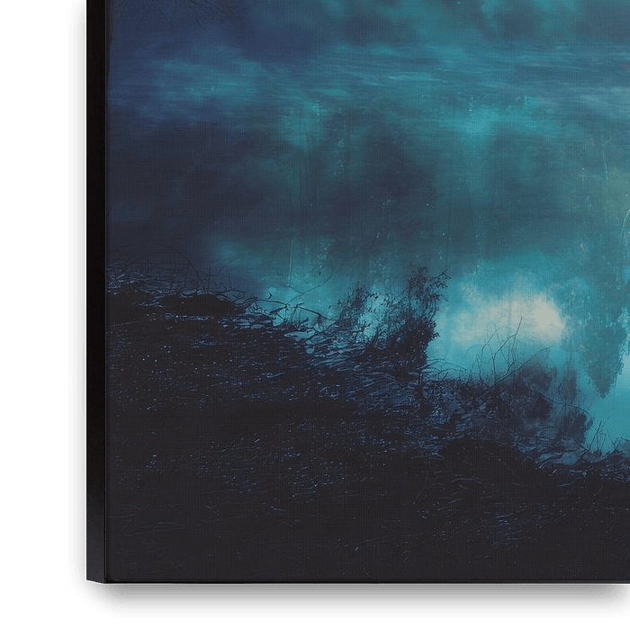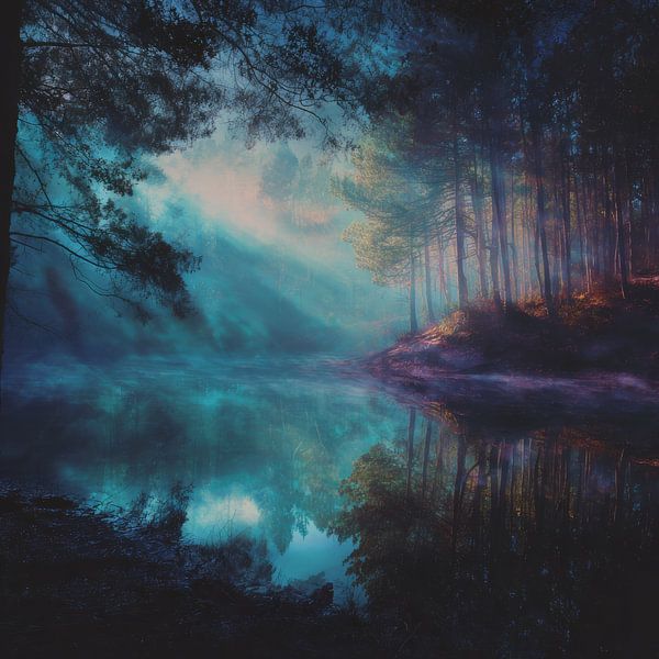 Soft rays of sunlight fall diagonally through a quiet forest and touch the calm waters of a hidden lake. Between slender trees and light mist, a landscape emerges in which blue-green shadows and warm golden light meet. The water is mirror-smooth and catches the rays like whispering lines of light passing through the forest. The banks…