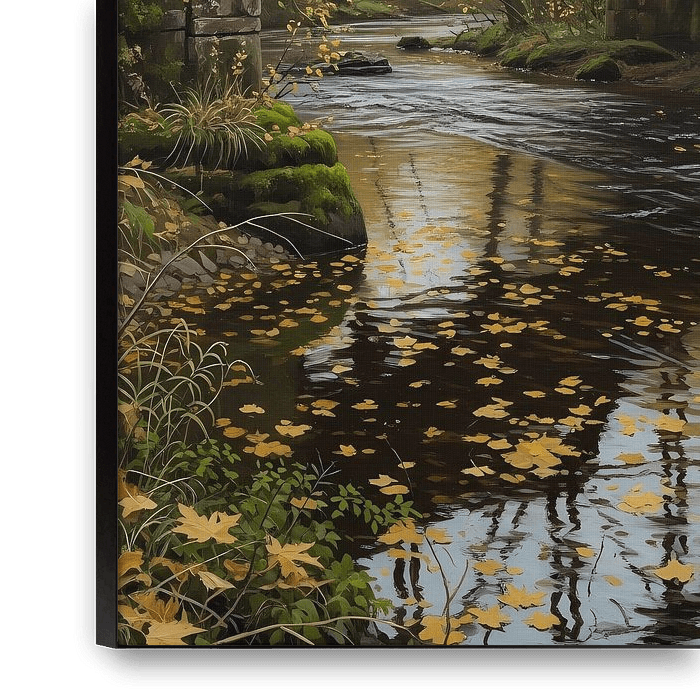 This artwork depicts an old iron bridge stretching quietly across a narrow stream, surrounded by trees in the soft transition of autumn. Moss and vegetation slowly reclaim the structure, blending human-made geometry with the organic flow of nature. Fallen leaves drift across the surface of the water, creating gentle reflections that…