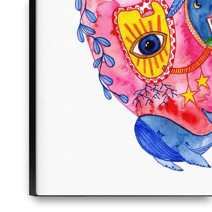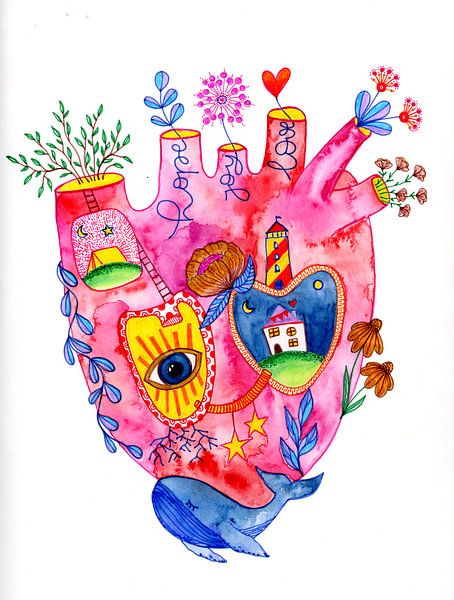 A heart that is more than just an organ – a whole world. This richly detailed watercolour depicts an imaginative, anatomical heart that becomes a living space: small houses, a watchful eye, plants, stars and maritime elements merge to form a poetic inner landscape full of symbolism. Each section tells its own story – of love, memory,…