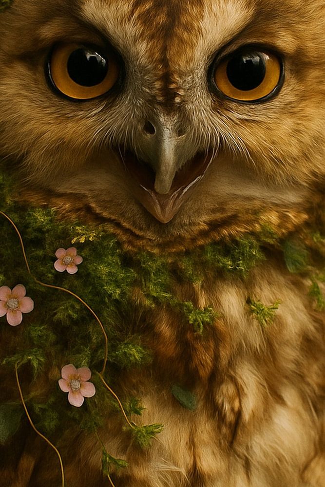 In this work, an owl looks straight at you - not with menace, but with awakening curiosity. Its eyes sparkle like amber under the canopy, while soft layers of moss and blossoms seem to grow naturally from its plumage. The image is magical but earthy, enchanting but not unnatural. This owl is an in-between being: animal and nature in one. My inspiration came from the feeling that the forest is alive - that consciousness also exists in trees, flowers and eyes you don't expect. In the interior, this image creates a combination of power and stillness. The owl seems to be saying, "I see you." Perfect for a space where magic may be felt but always remains connected to softness and earth.