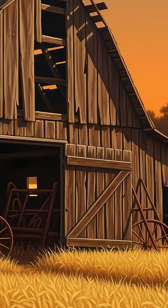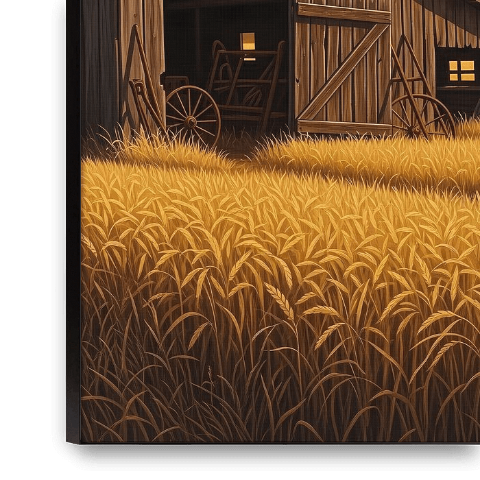 This artwork shows an old wooden barn standing quietly beside a field of golden grain, bathed in the warm glow of sunset. The structure bears visible signs of age—weathered planks, uneven textures, and simple tools resting inside—yet it remains grounded and dignified. The surrounding field moves gently in the evening light, while…