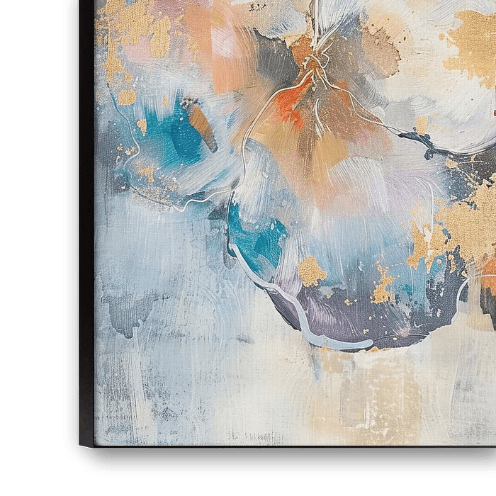 Whimsical Flower Symphony - This abstract painting shows a vibrant and expressive composition of flower-like shapes, mixed with dynamic and splashing paint strokes. The brushstrokes suggest organic shapes, reminiscent of large, lush flowers. The background is a subtle mix of grey and white tones, over which the flowers seem to float. Accents of gold splashes enrich the composition, giving it a sense of luxury and movement. The flowers themselves are not realistic; they are stylised with colourful outlines in shades of blue, orange, pink, and purple, creating a dreamy and almost ethereal atmosphere. This artwork uses various techniques such as dripping and splashing, contributing to a sense of spontaneity and freedom.