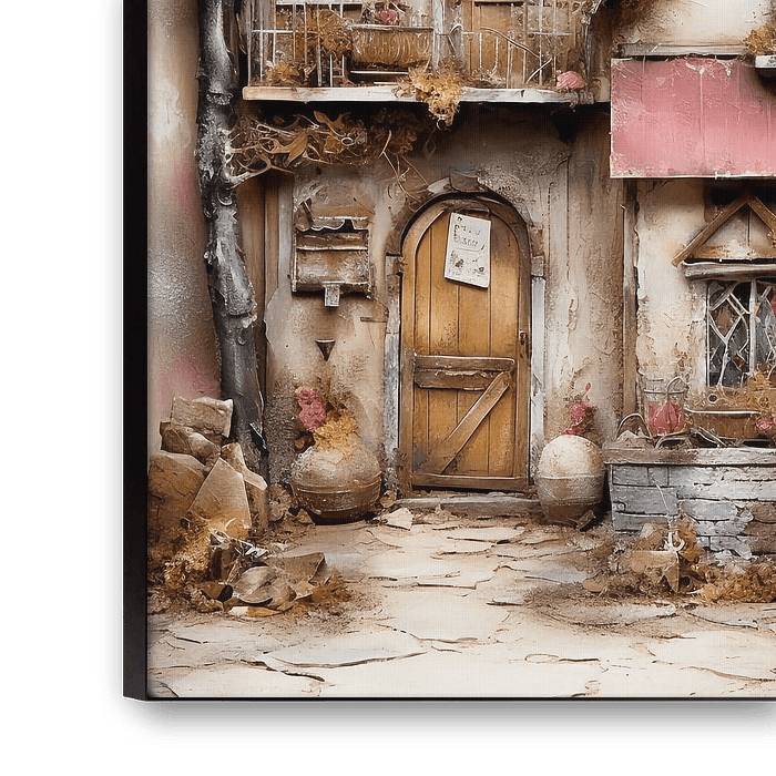 Buy this collage Whimsical house in the village by haroulita on canvas, ArtFrame, poster and wallpaper, printed on demand in high quality.