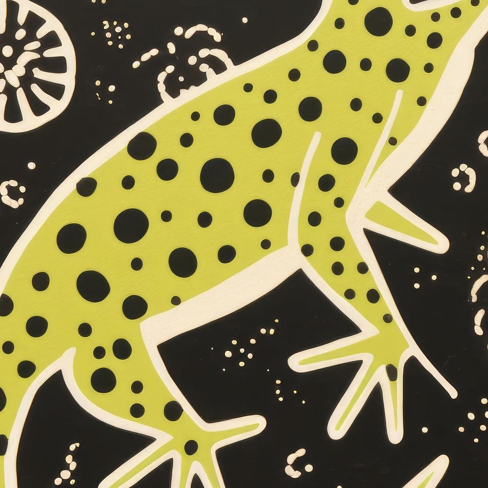 I shaped this piece to feel iconic rather than literal. A limited palette keeps the mood contemporary and allows contrast and geometry to do the speaking. The tiny bursts and dotted trails suggest night air and distant light, turning the gecko into a small constellation of its own.