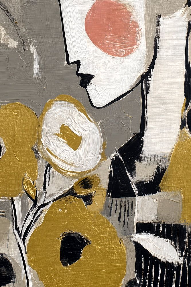 Whispering Blooms captures the moment when someone listens to the language of flowers. The figure leans towards them, as if their delicate blossoms hold ancient tales. Gold and peach blend together into a warm, tender light that caresses the contours. This work exudes intimacy – a quiet encounter between humanity and nature, captured in…