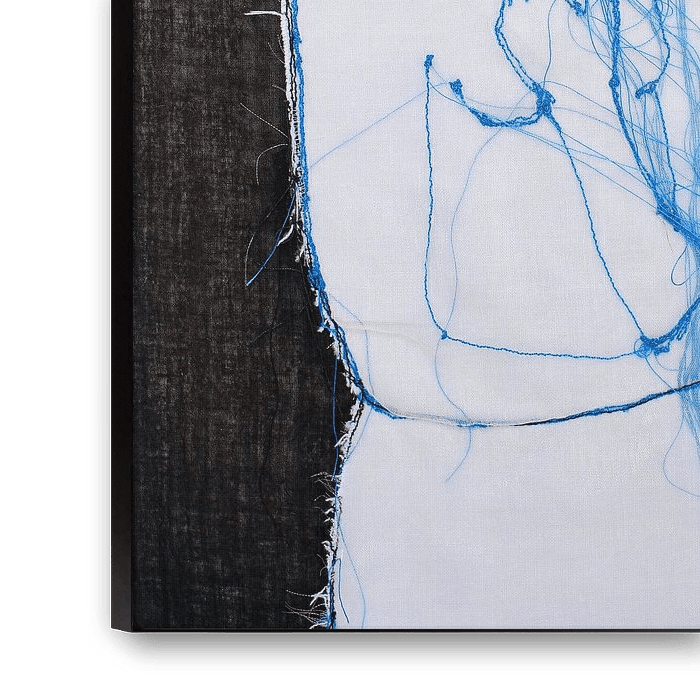 A figurative work of blue thread, textile & lace on black canvas. A representation of an introverted woman. The colours black-blue & white give an atmosphere of rest, the loose threads show the movement (of thoughts).