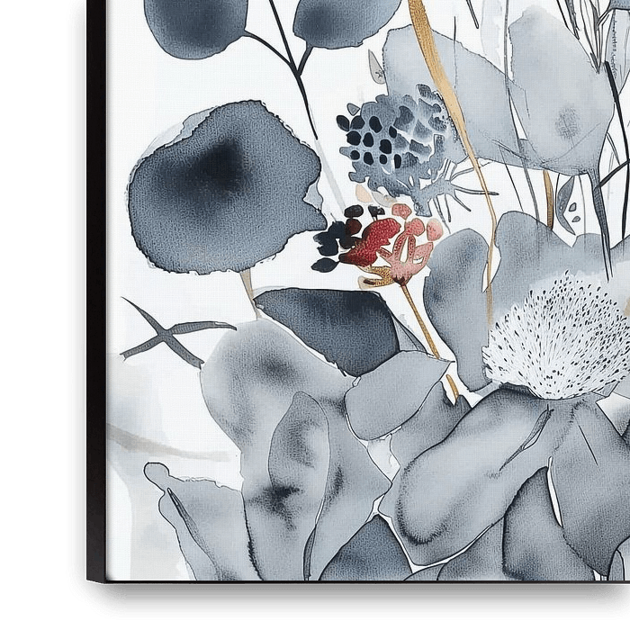 Botanical composition executed in a soft colour palette of grey, blue and gold tones, with a striking single red flower taking centre stage. The subtle colour nuances and diverse flora create a calm and balanced scene. The lines and placement of the plants create a sense of depth and texture. This illustration exudes a serene and…