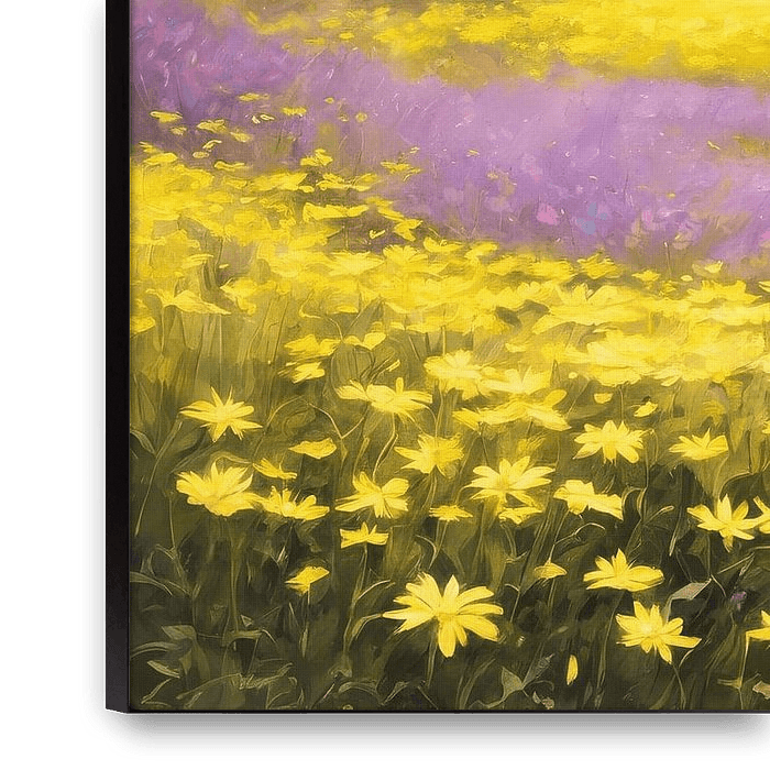The digital painting 'Whispering Flora' takes you to a field where time gently passes and nature speaks in all its glory. The scene is filled with a sea of purple and yellow flowers, stretching to the horizon where they enter into a peaceful dialogue with the calm sky.