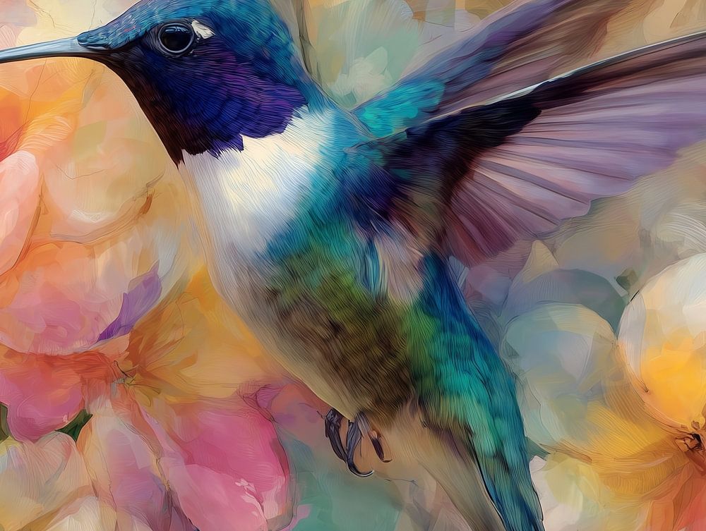 "Whispering Wings - Hummingbird in Blossom Light" shows a hummingbird in full flight, surrounded by an explosion of blooming flowers. The iridescent feathers and soft pastel shades create a dreamy atmosphere that exudes tranquillity and sophistication. This work speaks to lovers of botanical art, exotic birds and serene interiors. Perfect for living rooms, bedrooms, office or wellness areas.