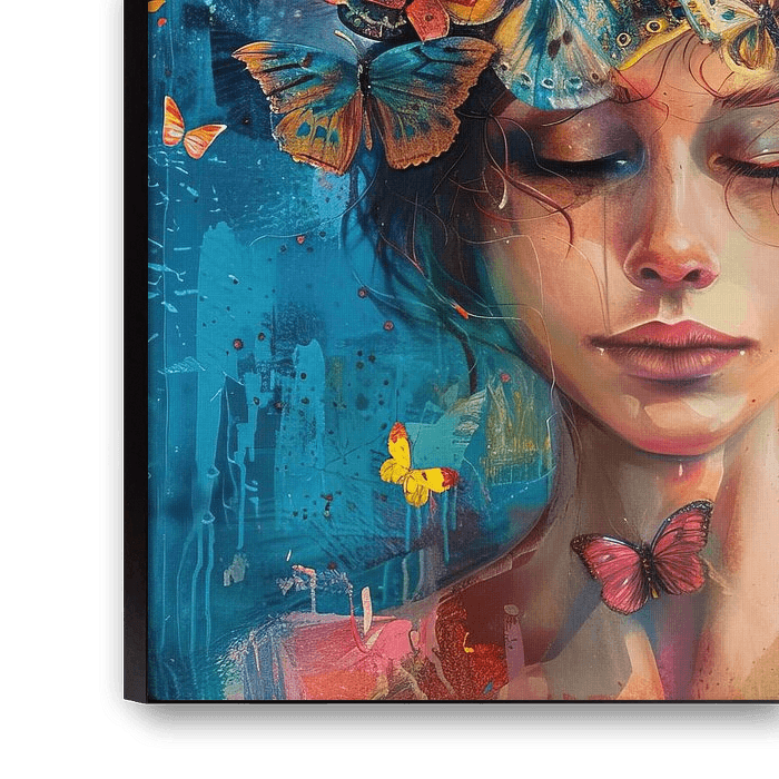Whispers of Nature's Beauty - This women's painting shows a female portrait decorated with a vibrant colour palette of butterflies surrounding her head, against an abstract, blue background.