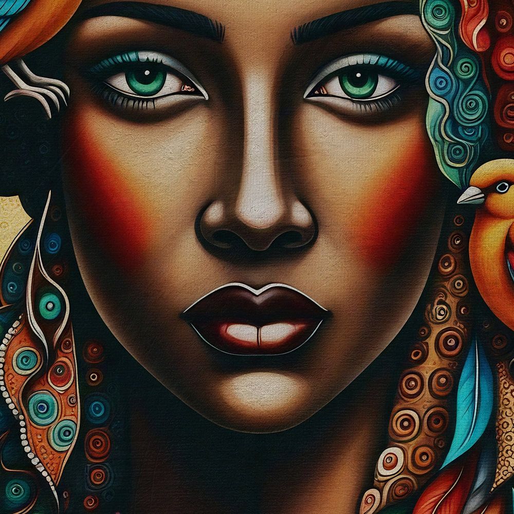 The painting shows a woman looking at something with a calm, unwavering gaze. It is as if she is looking beyond the surface to see something that is not there. Her eyes show strength and determination, but they also seem pensive - a balance of resilience and composure that feels timeless. She has a deep connection with nature and her portrait is full of symbolism.