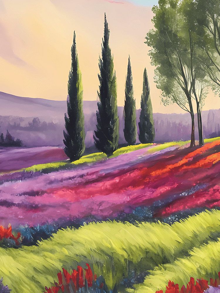 This vibrant artwork captures a breathtaking vista of rolling hills bathed in a kaleidoscope of floral hues. Swathes of lavender and deep magenta dance alongside fields of lime green and bursts of scarlet, creating a tapestry of color that stretches towards a soft, pastel-streaked sky. Elegant cypress trees punctuate the horizon, adding vertical grace to the sweeping landscape, while taller, broader trees stand as sentinels on a gentle rise. The scene evokes a sense of tranquility and the abundant beauty of nature.