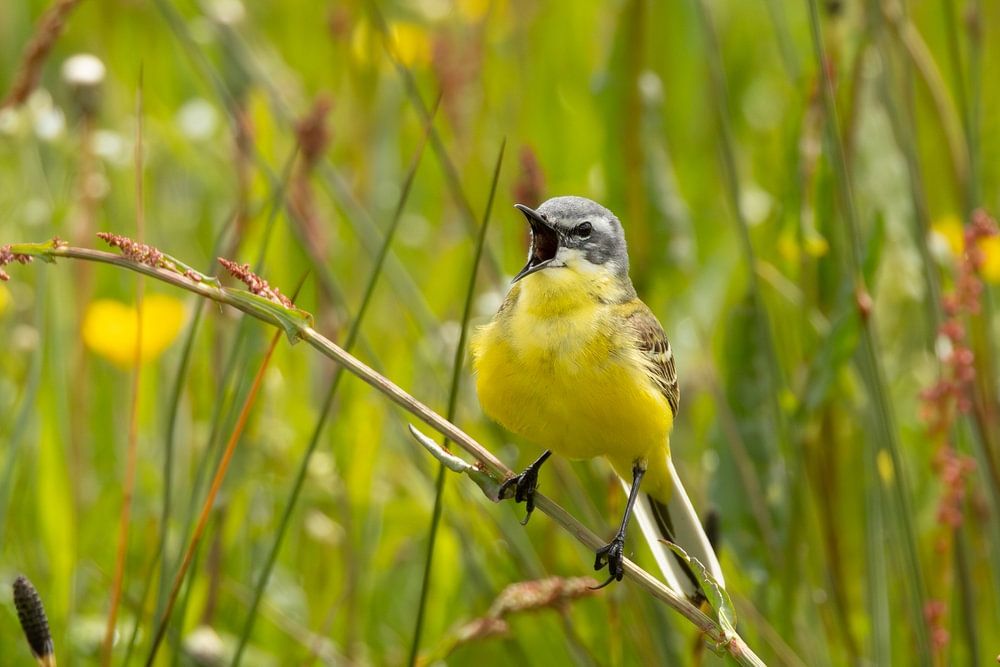 Among the green grass, yellow and red plumes, this yellow wagtail was happily whistling!
