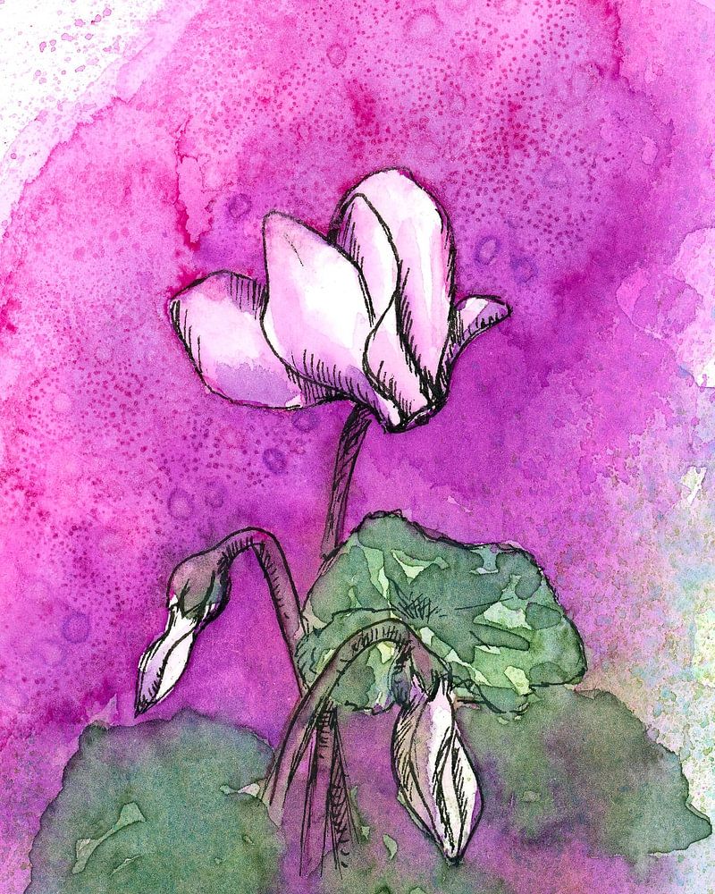 White Cyclamen on Pink is a drawing in black ink of a beautiful blooming white cyclamen flower with blossoms and buds coloured with vibrant watercolour lavender. The bright white flowers have a slight hint of pink, so I chose a strong pink as the background colour. The dark green leaves make the brilliant flowers shine even brighter. As a houseplant, these beautiful delicate flowers mainly bloom in the winter season. But some of these plants also grow in the garden and delight us in summer with their beauty in shades of white, pink, purple or deep red. 156