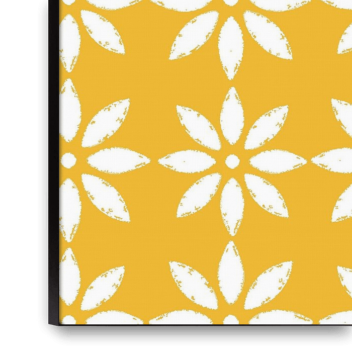 This artwork presents simple white floral forms placed on a soft yellow background. The clean shapes and gentle contrast create a bright and airy composition, giving the piece a light and uplifting feel while keeping a calm and balanced appearance.