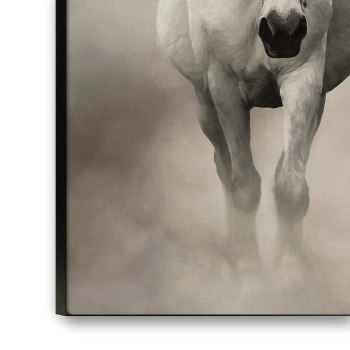 White horse walking in fog. The photo of this beautiful white mare was digitally processed on a foggy background for a fairytale, dreamy effect.