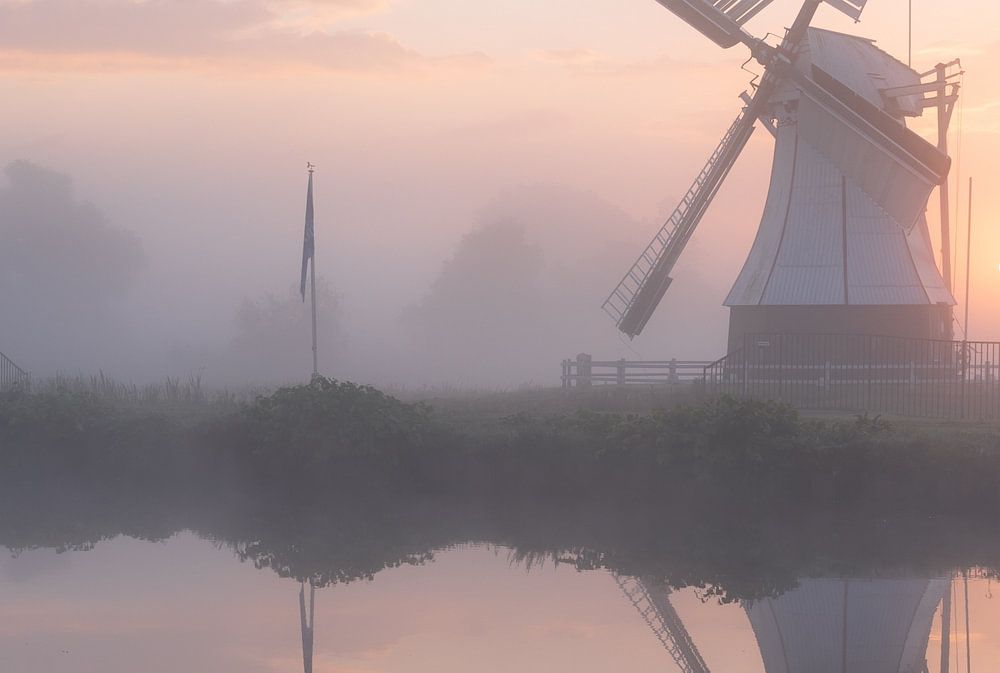 A calm morning at the White Mill, reflected in the North William Canal. The sun is just poking through the fog, bringing beautiful colors to the day.