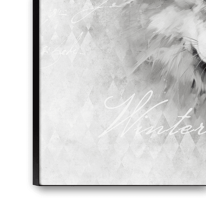 The picture shows a majestic wolf in monochrome mixed media art, surrounded by filigree handwriting elements in white and grey. The use of only one colour palette gives the painting a timeless elegance and a certain calmness. The wolf radiates a powerful presence while surrounded by the subtle lettering elements that create a mysterious and profound atmosphere. The handwriting elements add a personal touch, as if the wolf itself is telling its story. This monochrome mixed media art poetically captures the wintry mood, beauty and spirit of the wolf.