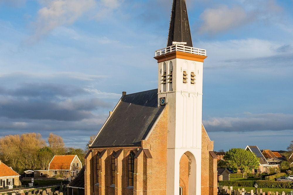 The little white church of Den Hoorn, this high-resolution drone shot was taken in the evening sun. The low light streaks across the real Texel garden walls and gives a nice depth to the landscape. On the left in the image a couple of sheep with lambs symbolising new life while next to the church is a small cemetery - for nice contrast.