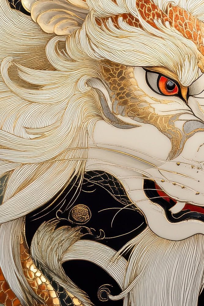 This impressive artwork depicts a white dragon with fiery orange and red moons, enhanced by gold accents and flowing patterns. The design exudes power, energy and dynamism, bringing a unique character to your interior. The dragon symbolises protection and luck, making this artwork not only beautiful to look at, but also bringing positive meaning. The contrast between the light head and the fiery details makes this piece a real eye-catcher. Ideal for above a sofa, in an office or as an eye-catcher in a modern home. The refined lines and rich colour combination create a luxurious look that suits various interior styles. With this artwork, you bring a powerful symbol into your home that beautifully combines style and meaning.