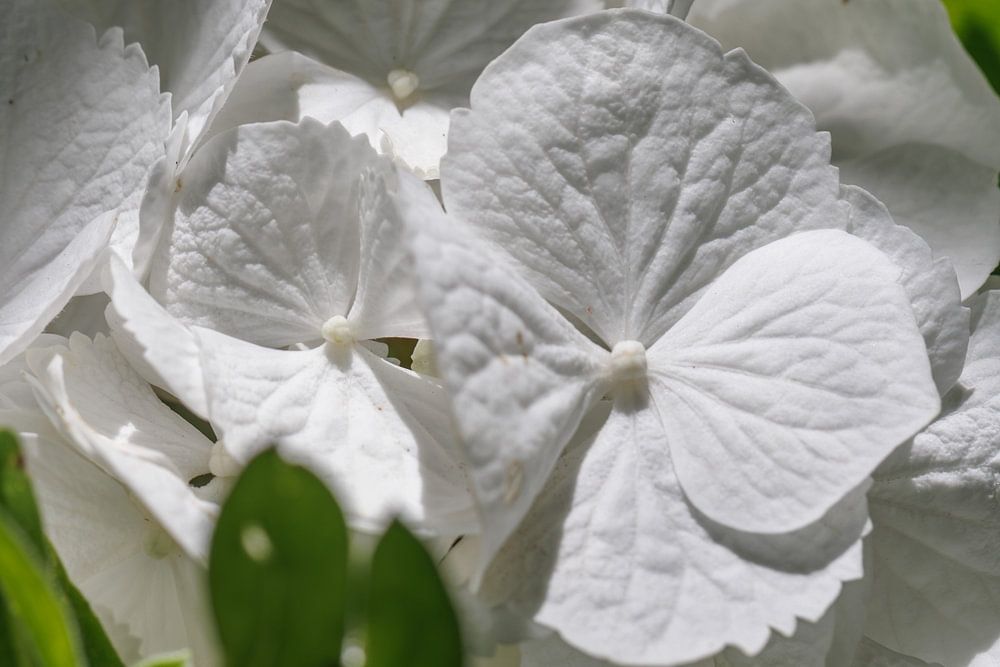 Macro photography white hydrangea blossoms in summer grazing light, sunny highlight. Selective focus, sunny, garden ambience, allotment, cosy, garden paradise, morning light, blossom, flower, garden bed