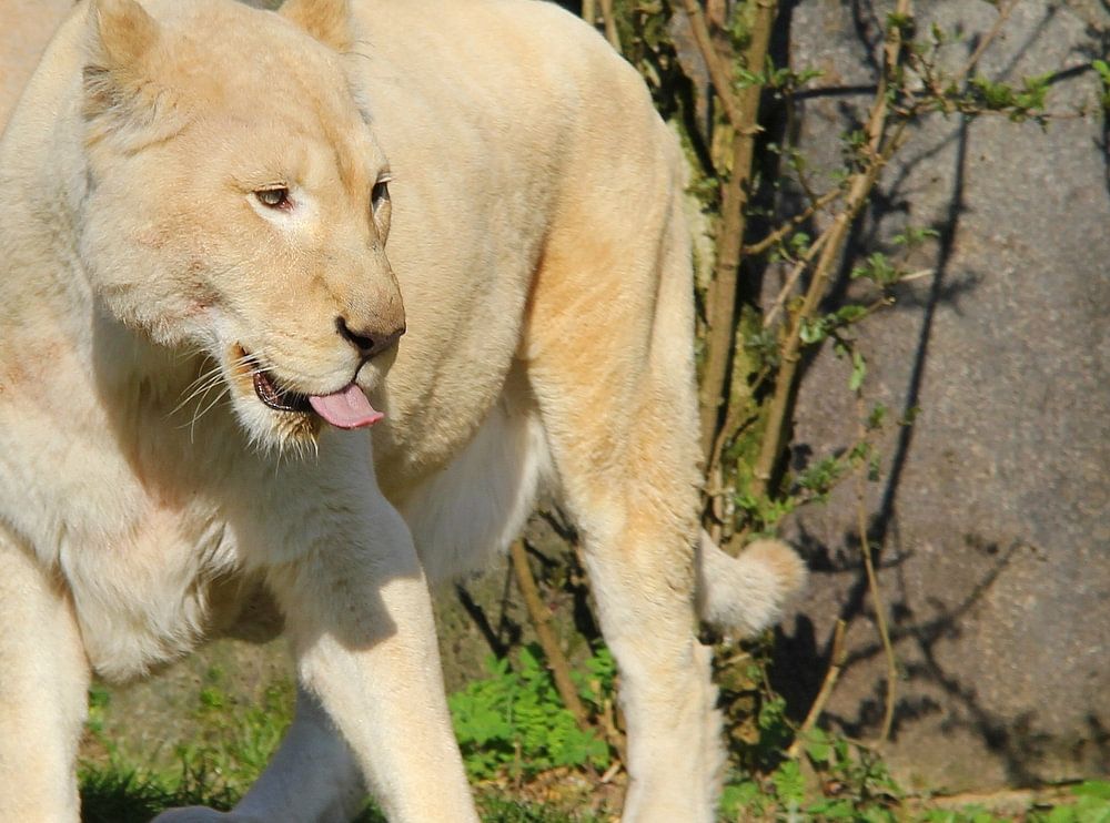 Lions usually have a hazel or golden brown colour for their fur. However, in the case of white lions, the fur is either completely white or a very pale version of the usual hazel fur. The colour of the coat can range from blonde to almost white. This colouration is inherited from the parents but is a recessive trait, meaning that a hazel coloured lion is more likely to be born from hazel coloured lions than that of a white lion. Similarly, breeding in white lions can result in brown necks. source wikipedia.