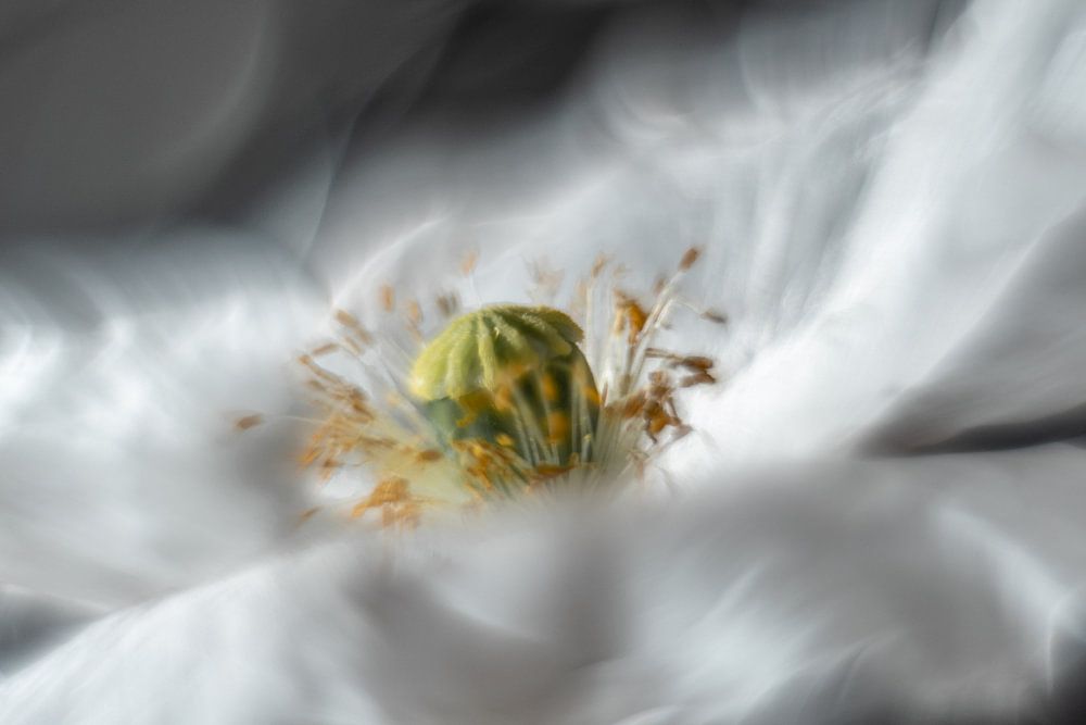 A wild flower from the poppy family. The white poppy is less common. It was photographed with a Helios lens. The strange bokeh creates a surrealistic representation of reality.