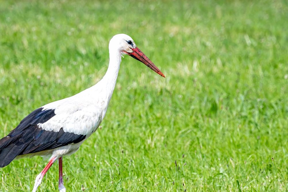 White stork strides through a green meadow