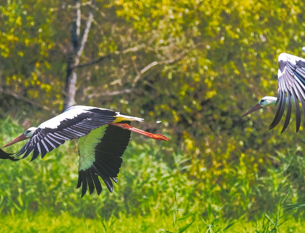 Buy this bird art White storks flying over a field by ManfredFotos on canvas, ArtFrame, poster and wallpaper, printed on demand in high quality.