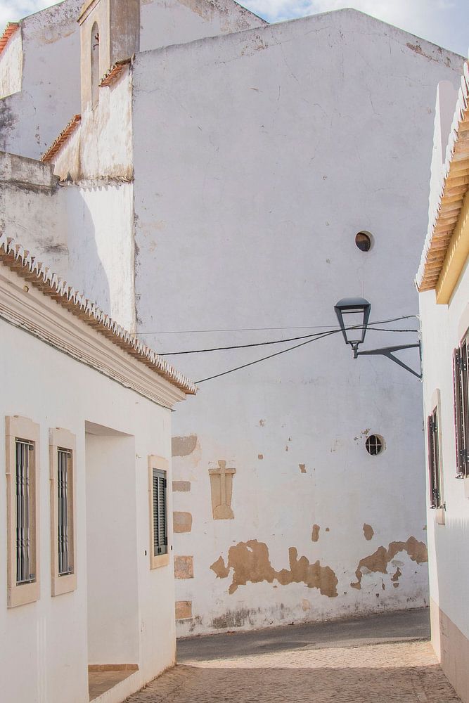 Beautiful village in the Algarve in Portugal. Typical buildings with white walls and yellow details
