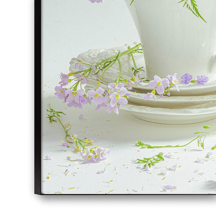 Still life of three stacked heads and saucers with key flowers inserted and scattered around them against a white background. The ultimate challenge to create a work with white heads and saucers and background. As simple and serene as possible.