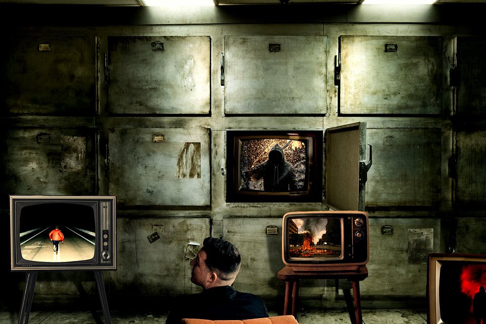 Dark surrealistic print. In an abandoned psychiatric hospital