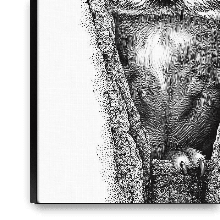 This striking black-and-white illustration captures a wide-eyed owl peeking from a natural tree hollow, framed by rugged bark textures and soft stippled shading. The owl’s face is rendered with fine, hairline strokes that create a plush, feathery look, while the glossy eyes and sharp beak form a strong focal point. Subtle gradients of…